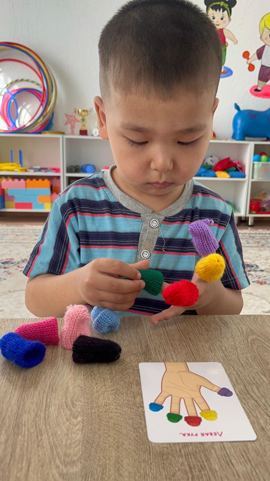 Мақсаты: ұсақ қол моторикасын дамыту, «оң», «сол» үғымдарымен таныстыру, түстерді ажыратуға үйрету