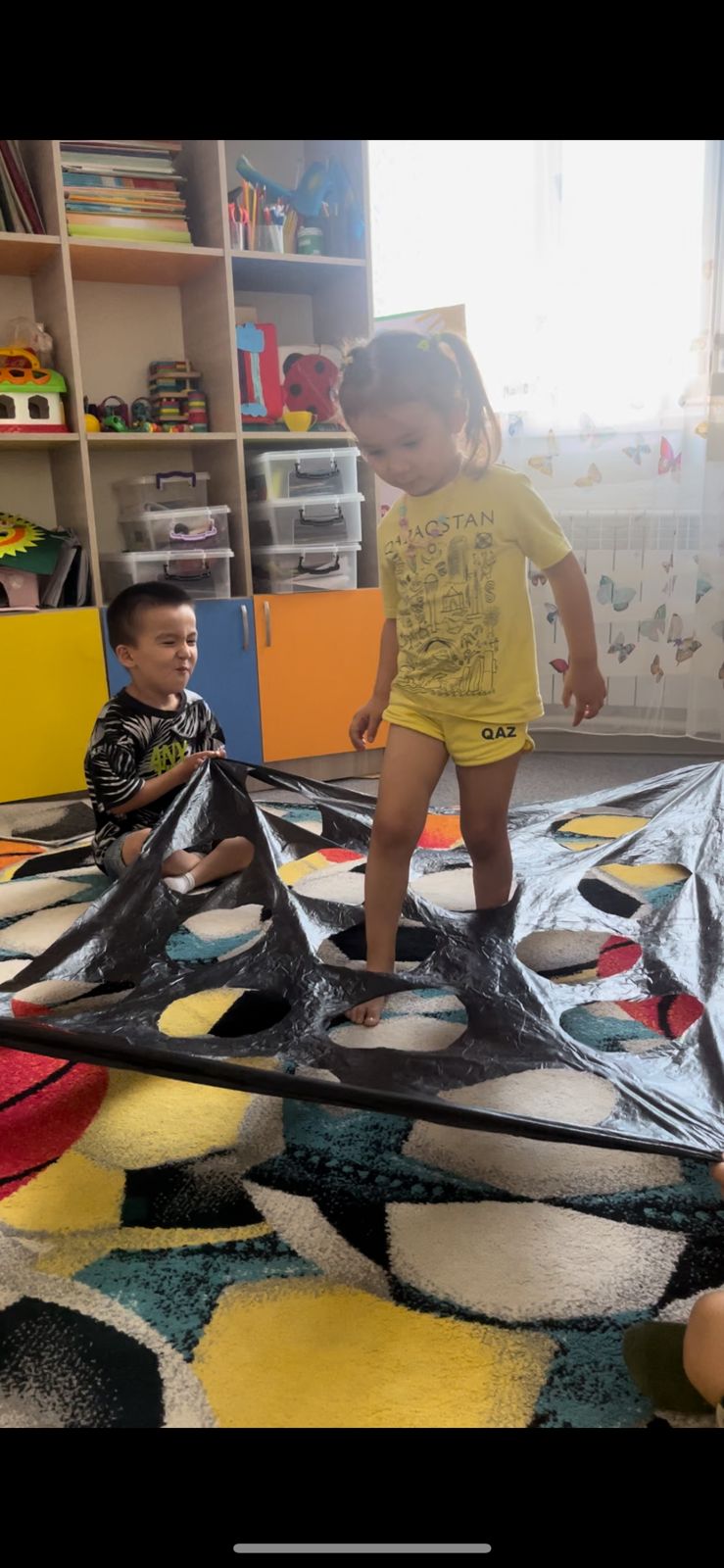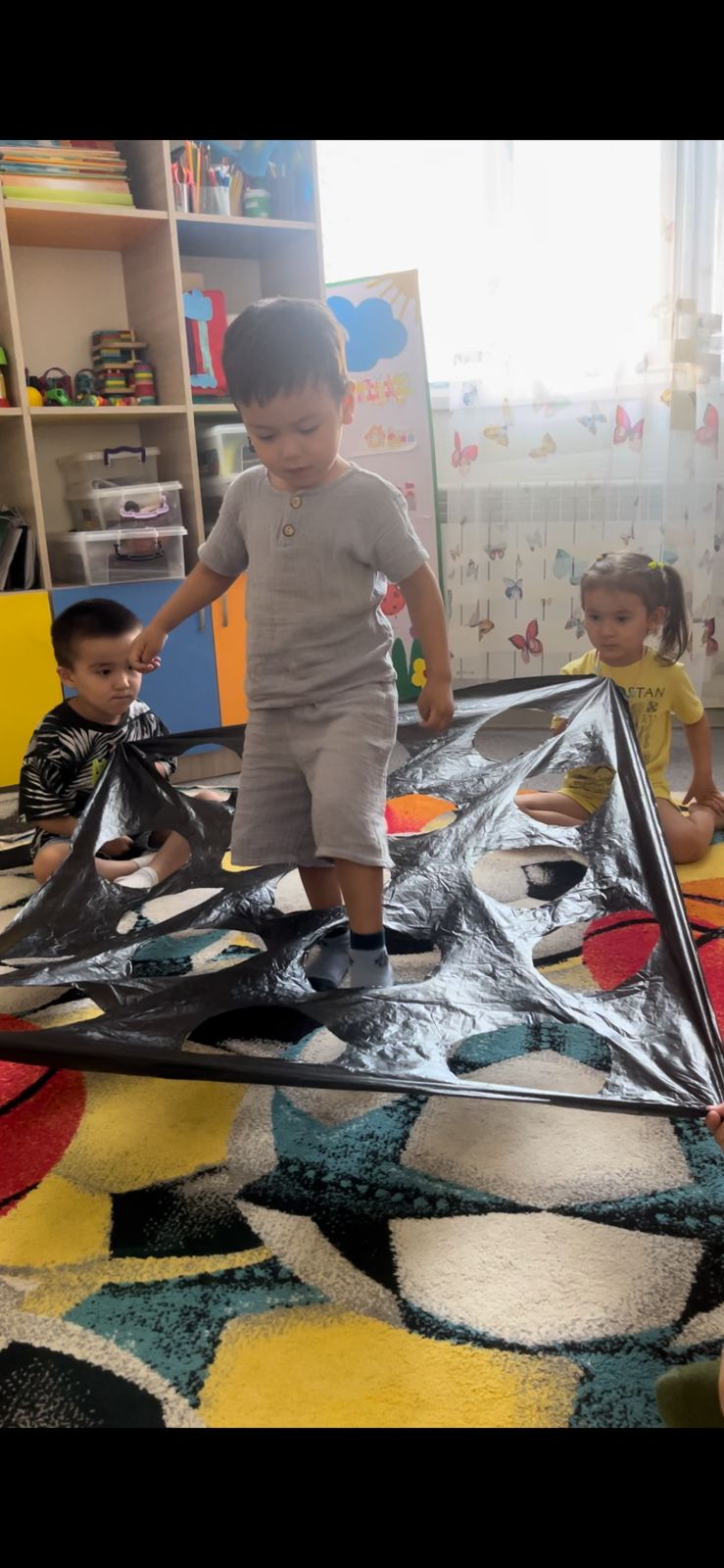 Мақсаты: баланы тепе-теңдікті ұстауға дағдыландыру. Балалар ойылып тесілген матадан аяқтарымен өтеді